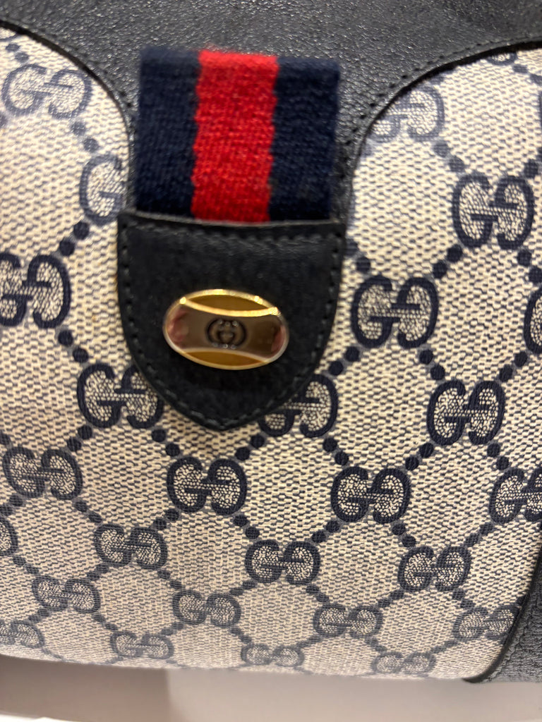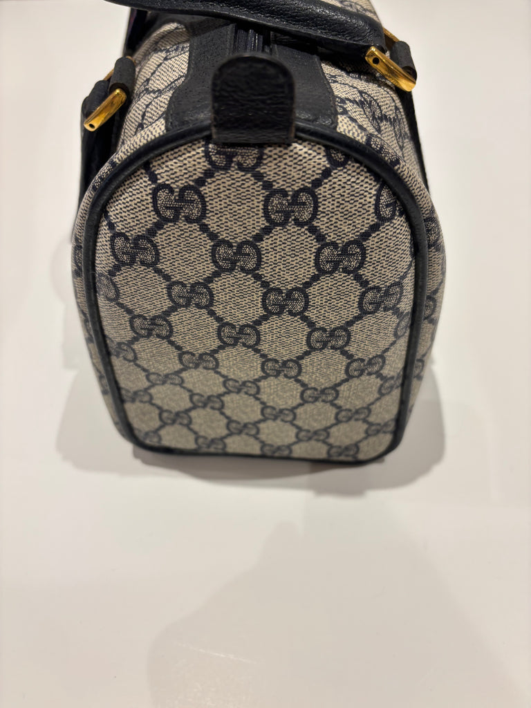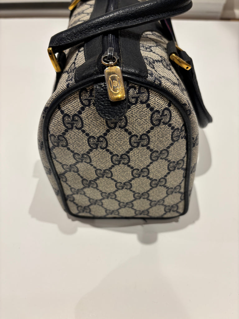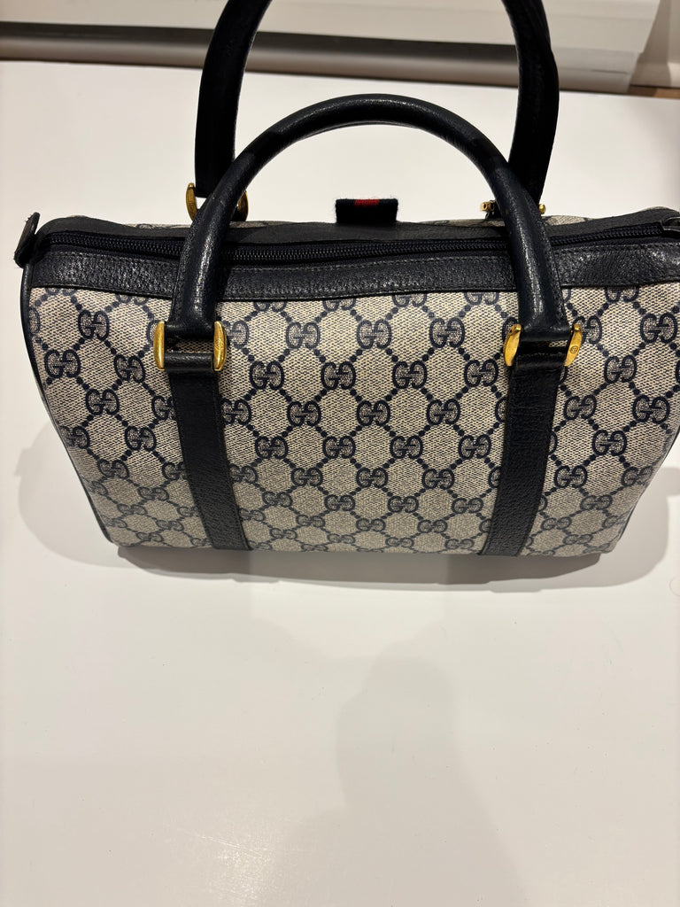 1980s Gucci Boston Bag which has now been reissued. Get greater craftsmanship at a fraction of the price. We are resellers of authentic vintage designer clothing and accessories, and are not associated/affiliated with the brand. All rights legally belong to the legitimate brand owners.