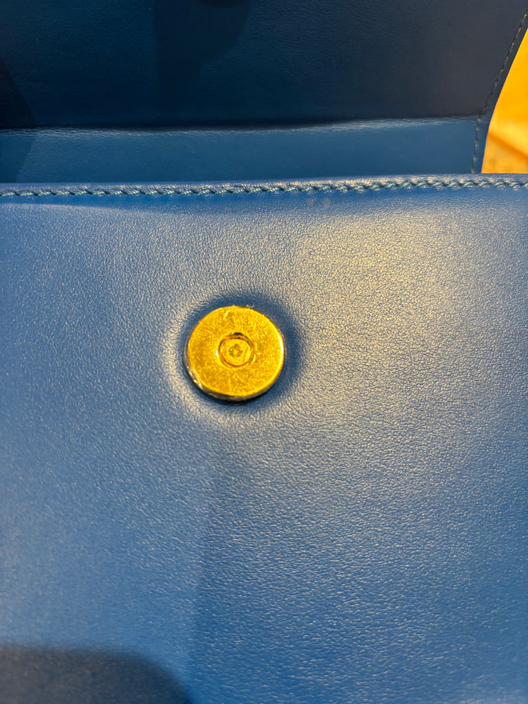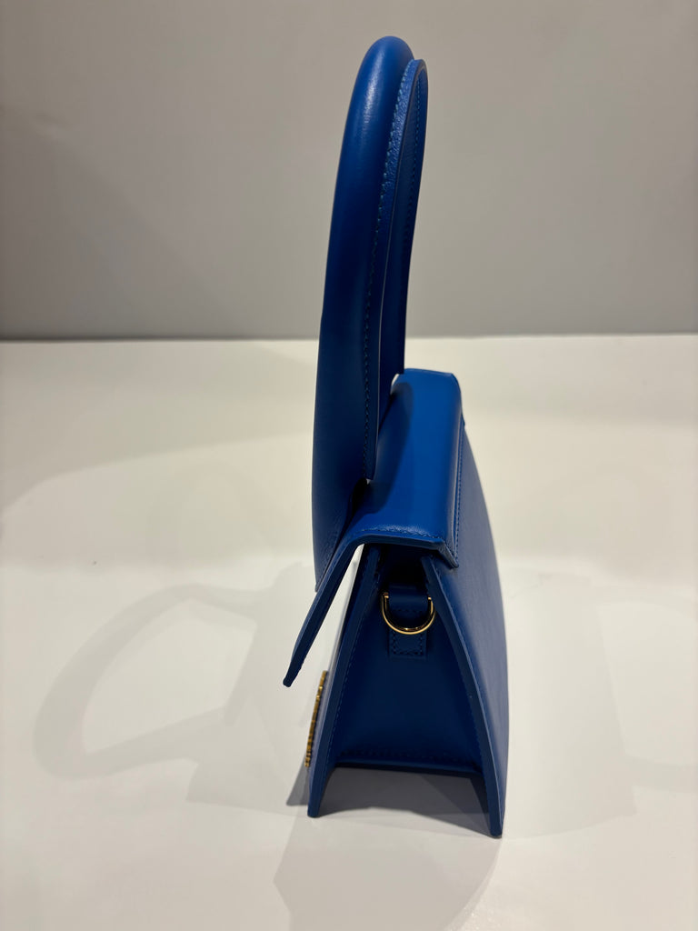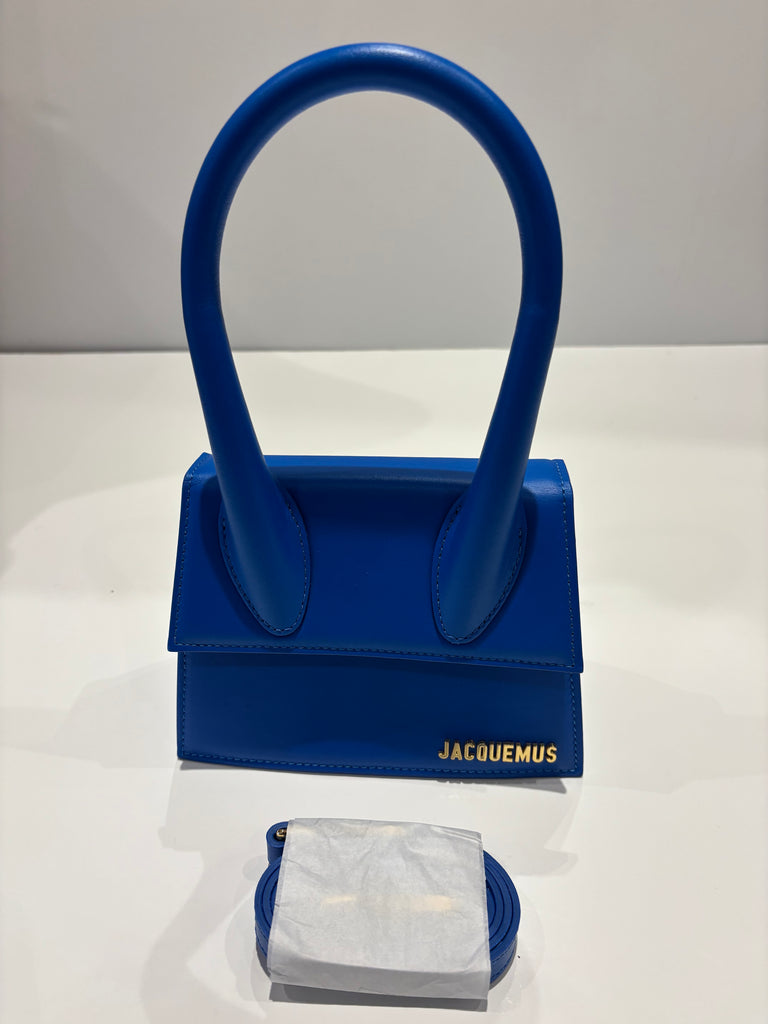 This is a new Jacquemus Chiquito Moyen in electric blue. It can be worn as a top handle or crossbody. It has a an adjustable and removeable strap; inner pocket; gold logo at the front and magnetic closure.